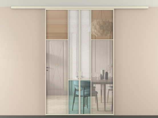 Дополнительно на раздвижную двустворчатую перегородку вдоль стены и четырехстворчатую перегородку внутри проема с двумя неподвижным полотнами можно установить механизм синхронного открывания — при открывании одной створки, вторая открывается автоматически.