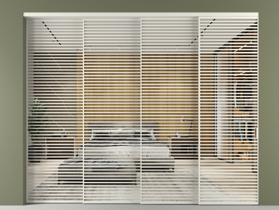Дополнительно на раздвижную двустворчатую перегородку вдоль стены и четырёхстворчатую перегородку внутри проёма с двумя неподвижным полотнами можно установить механизм синхронного открывания — при открывании одной створки, вторая открывается автоматически.